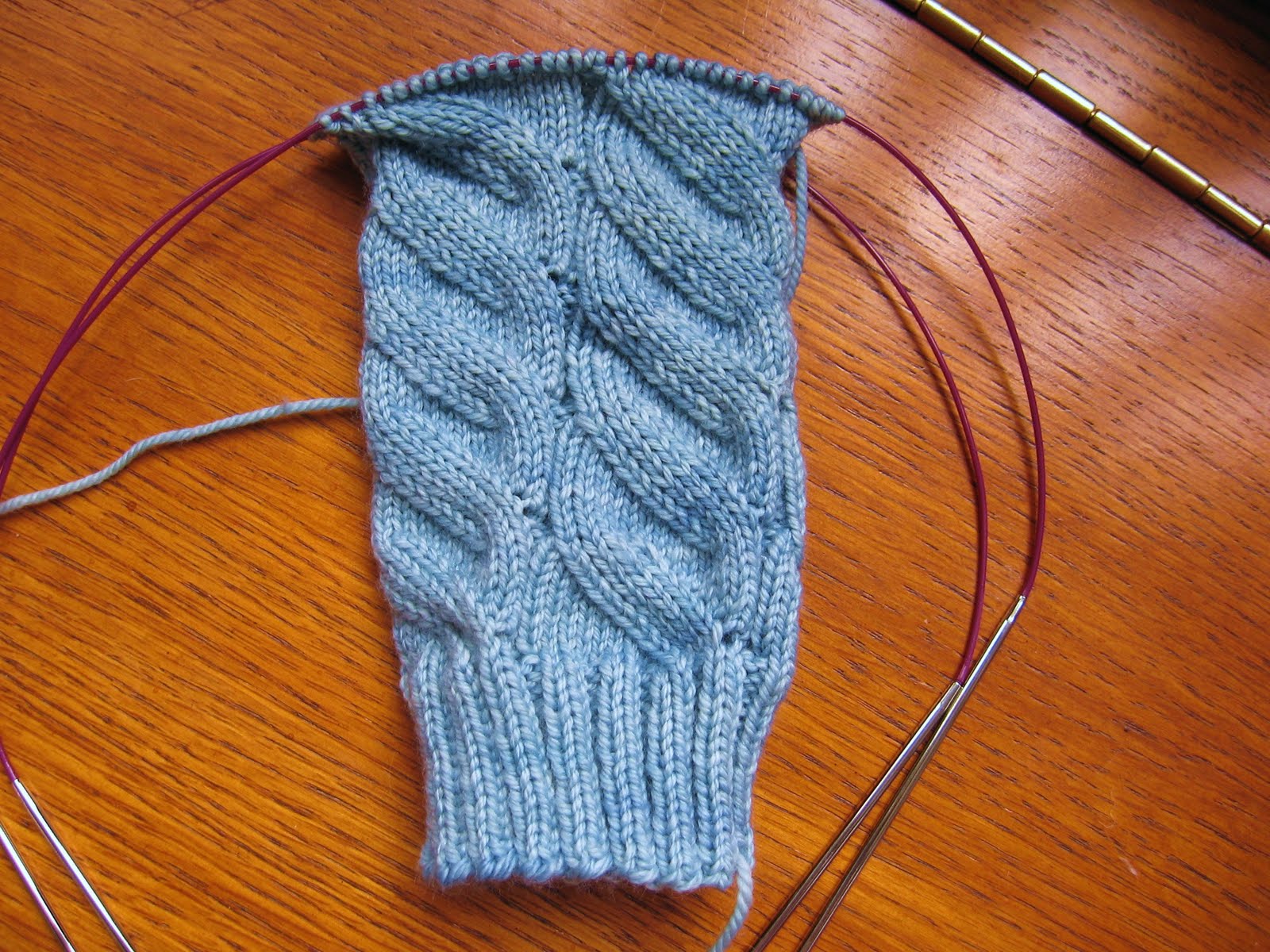 In knitting news, the Paper Crane is now 123 rows long. I realized that I was knitting a bit tighter, so my gauge might be too small for the bottom of the sweater. I think I can block it out, and if it's not perfect, that's ok -- the sweater is open at the bottom, so if it's a little smaller there, it won't be a big deal. I'm trying to loosen up the knitting now to get the upper part of the sweater sized properly. I don't have any new pics, so here it is 23 rows ago: